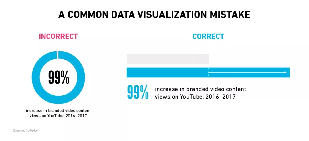 2016年至2017年间,在YouTube上品牌视频内容浏览量增长了99%。下图中显示99%的圆图就不对。这将使它看起来像99%的视频观看是品牌视频,然而事实并非如此。取而代之的是,您需要带有两个条形数据的条形图,一个表示2016年的基线浏览量,另一个表示比该基线增长99%: