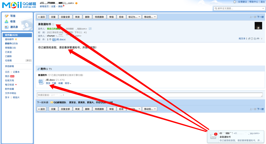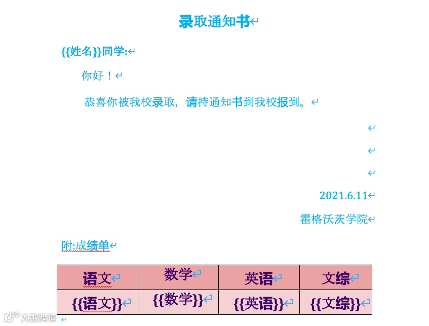 content='你己被我校录取,请妥善保管通知书,并按时报到!'