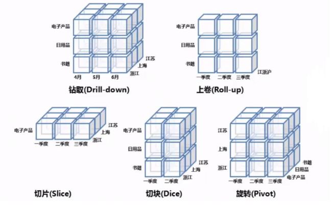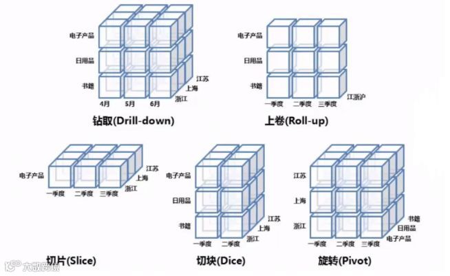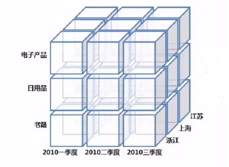 通过对多种维度的划分,运用立方体的形式进行展现,适用于大的数据量。比如: