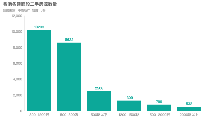 从建筑面积来看,香港在售二手房普遍建面在500呎-1200呎(46-111平方米),占比高达78.52%,共计18825套。