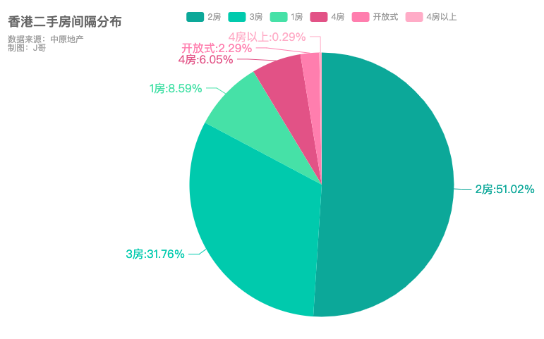 从居室来看,香港在售二手房中,2房共计12231套,占比51.05%;3房共计7613套,占比31.76%;4房以上71套,占比仅为0.29%。