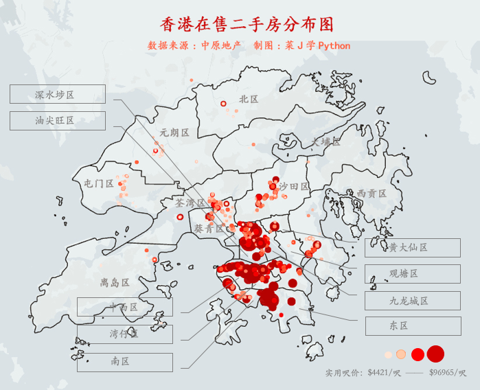 为了深入了解香港房地产市场,本文用Pyhton采集了香港在售26281套二手房数据并做可视化分析,试图从数据层面理解香港楼市现状。本公众号后台回复「香港」可获取本文数据分析代码和数据集。