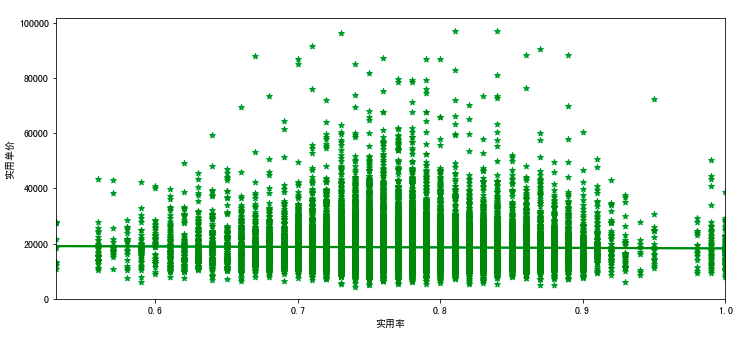 sns.regplot(x='实用率',y='实用单价',data=df1,color='green',marker='*',ax=axes[4])