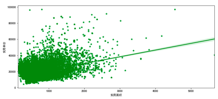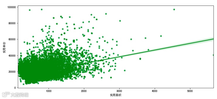 sns.regplot(x='建筑面积',y='实用单价',data=df1,color='green',marker='*',ax=axes[3])