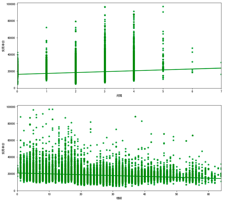 sns.regplot(x='楼龄',y='实用单价',data=df1,color='green',marker='*',ax=axes[1])