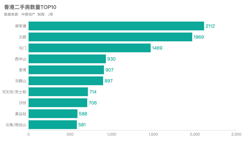 将军澳、元朗和屯门在售二手房均超1000套,其中,将军澳以2112套二手房源居首。