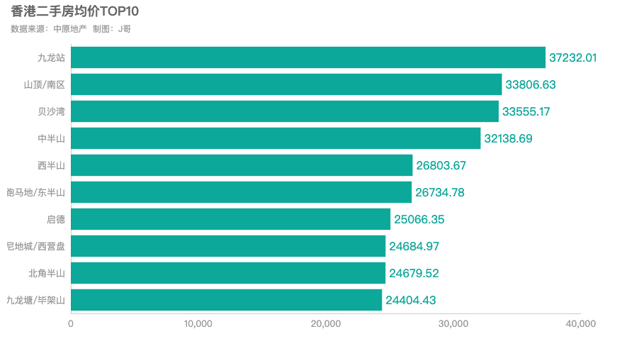 九龙站、山顶/南区、贝沙湾和中半山在售二手房均价超过$3万/呎,九龙站以$37232/呎遥遥领先,远高于香港二手房整体均价。