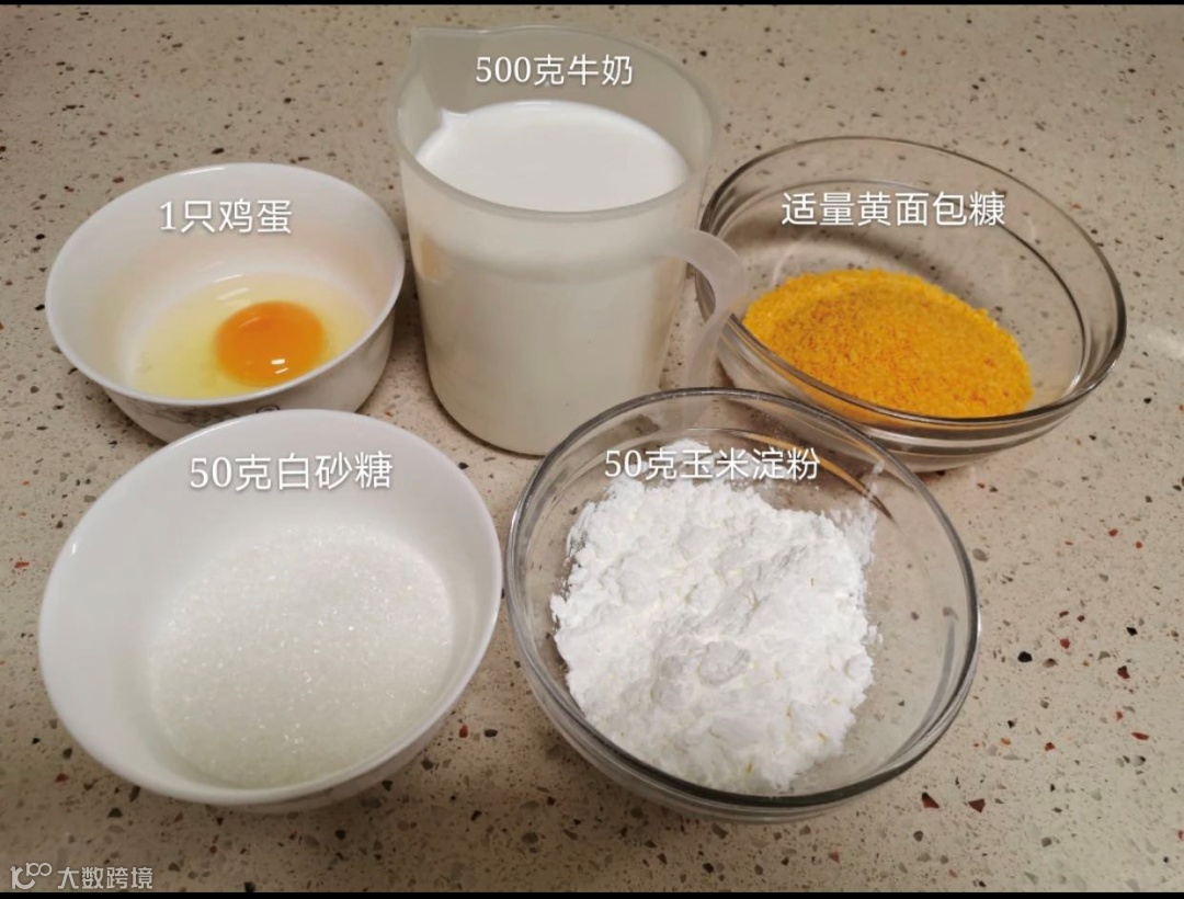 准备好了材料, 我们就可以开始我们炸牛奶制作啦, 500g 牛奶+50g 白砂糖 +50g 玉米淀粉, 搅拌均匀, 数据也是一样的,我们要把不同的数据进行组合