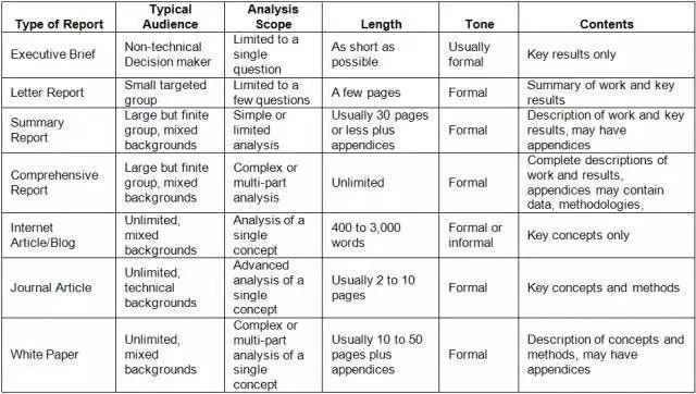您的报告是像政府部门的行政简报(不要混淆法律简报),信函报告,总结报告,综合报告,互联网文章或博客,专业期刊文章或白皮书等等。每一种报告都有自己的受众类型,内容和风格。