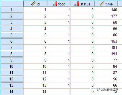 科研人员将同龄90只老鼠分成3组,分别给予低脂饮食、饱和饮食、不饱和饮食,并对每只老鼠注射等量的肿瘤细胞,观测200天,记录下这批老鼠的死亡和删失情况。数据选自卢纹岱老师主编的《SPSS统计分析》一书。