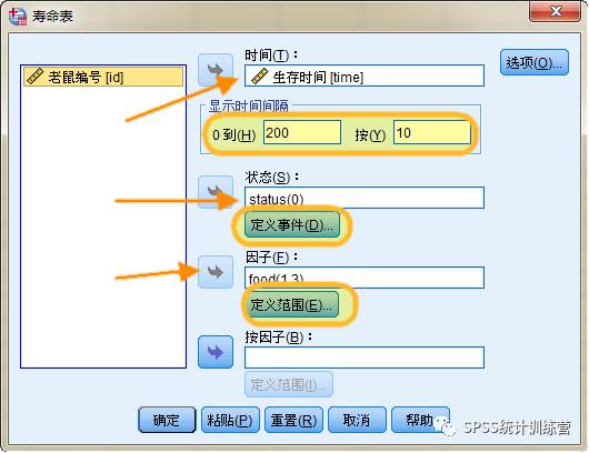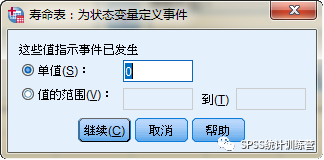 变量status(生存状态,0表示已死亡,1表示删失)移入状态栏,点击【定义事件】按钮,单值框内输入数字0(主要关注事件的结局),即指定死亡的标签。