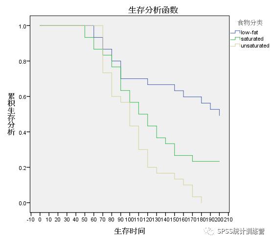 勾选“寿命表”,勾选“生成分析”即生存函数图。并勾选“总体”,即总体考察三种不同饮食下老鼠生存时间的差异。