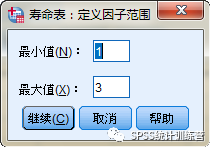 变量food(三组不同食物)移入因子栏;点击【定义范围】按钮,最小值输入1,最大值输入3。