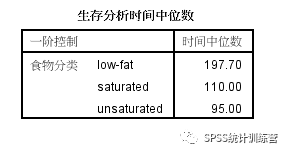 最后是总体比较的类似于方差分析的表格,采用的是威尔科克森统计量,不用管太多的原理,主要看显著性p值是不是能够小于0.05,此处0.02<0.05,说明三组不同饮食下老鼠的生存时间分布有显著差异,第四个问题得到解决。