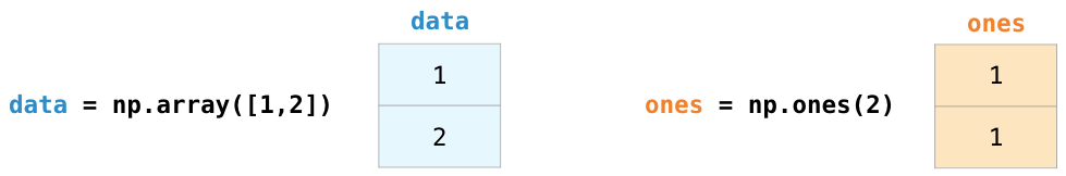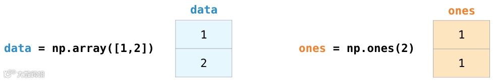 让我们创建两个 NumPy 数组来展示数组运算功能。我们将下图两个数组称为 data 和ones;