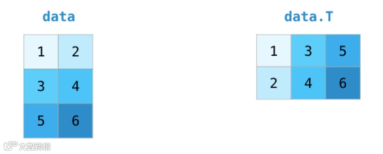 处理矩阵时的一个常见需求是旋转矩阵。当需要对两个矩阵执行点乘运算并对齐它们共享的维度时,通常需要进行转置。NumPy 数组有一个方便的方法 T 来求得矩阵转置: