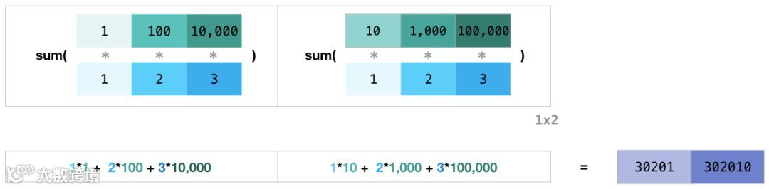我在上图的右下角添加了矩阵维数,来强调这两个矩阵的临近边必须有相同的维数。你可以把上述运算视为: