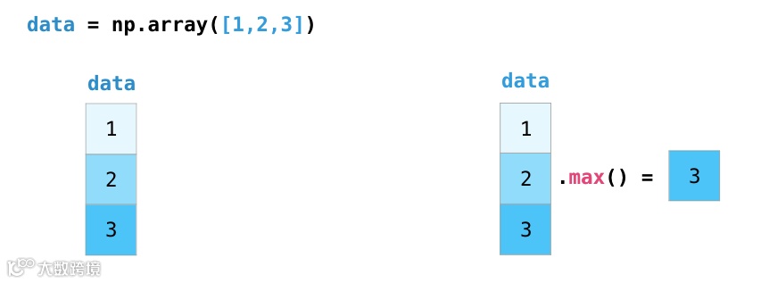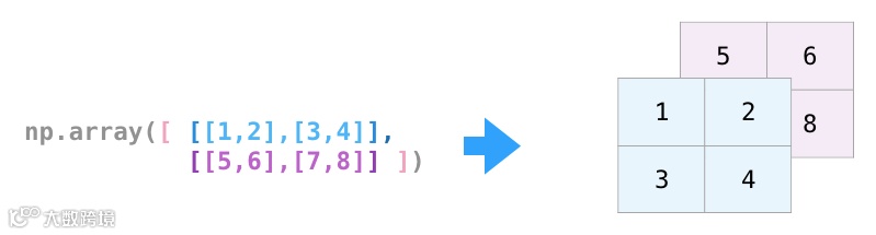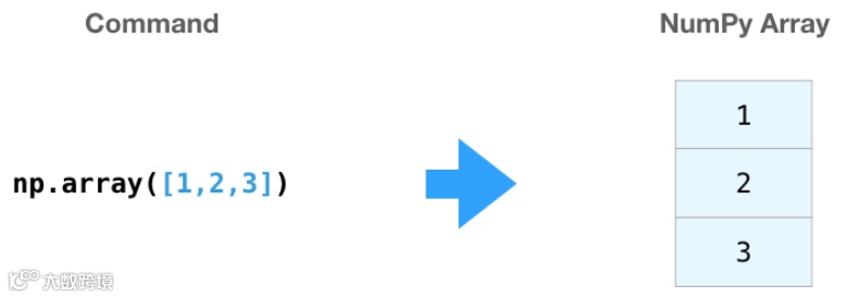 我们可以通过传递一个 python 列表并使用 np.array()来创建 NumPy 数组(极大可能是多维数组)。在本例中,python 创建的数组如下图右所示: