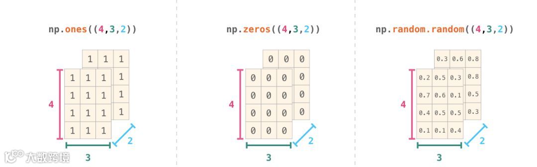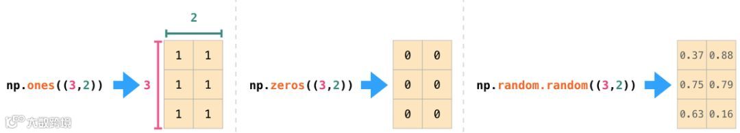我们也可以使用上面提到的方法(ones()、zeros() 和 random.random()),只要写入一个描述我们创建的矩阵维数的元组即可: