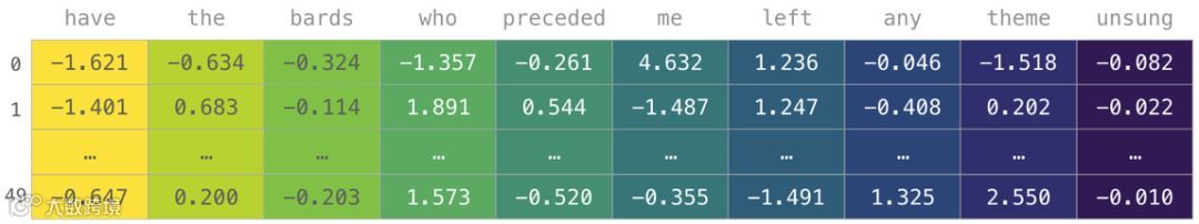 模型需要先查看大量文本,再用数字表示这位诗人的话语。我们可以让它处理一个小数据集,并用它来构建一个词汇表(71,290 个单词):