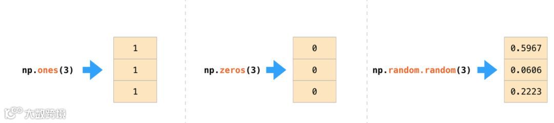 通常我们希望 NumPy 能初始化数组的值,为此 NumPy 提供了 ones()、zeros() 和 random.random() 等方法。我们只需传递希望 NumPy 生成的元素数量即可: