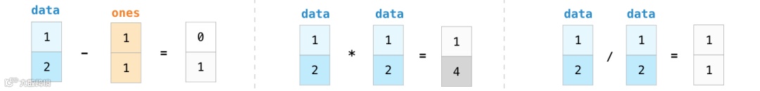 如果两个矩阵大小相同,我们可以使用算术运算符(+-*/)对矩阵进行加和乘。NumPy 将它们视为 position-wise 运算:
