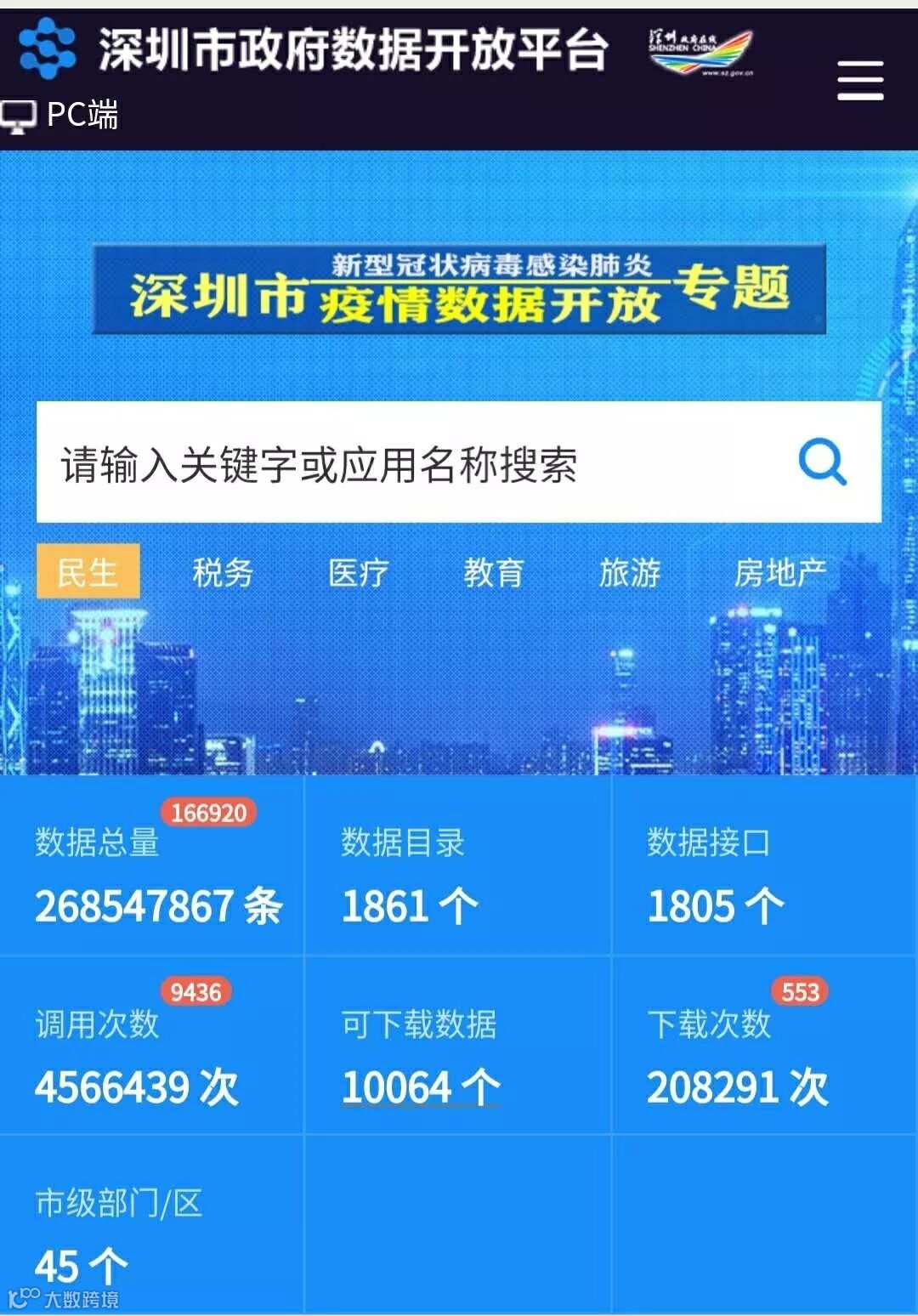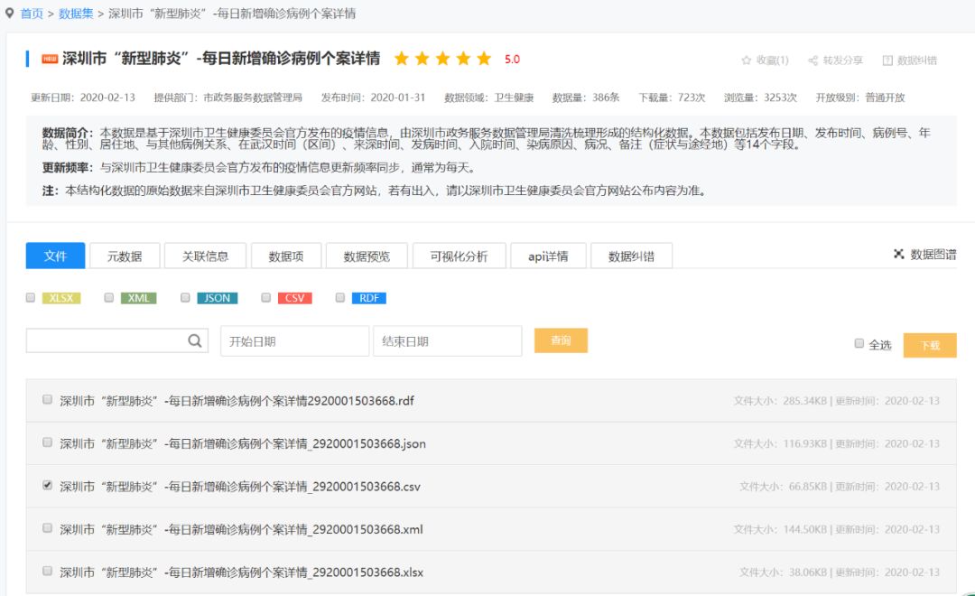 最近找疫情数据的时候,发现了深圳市政府数据开放平台这个宝库,它提供了深圳市各个行业数据下载,可下载数据有10064个喔!