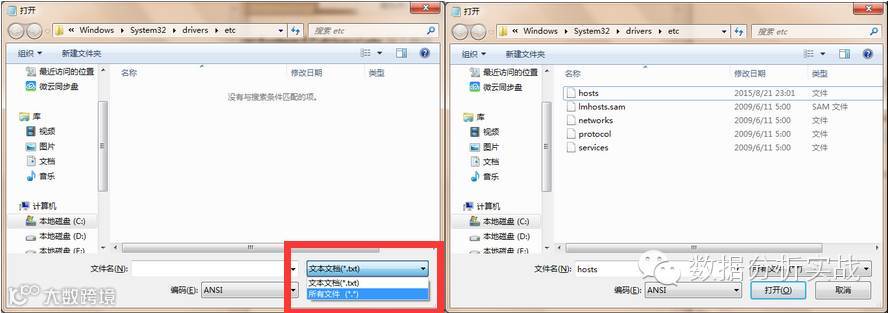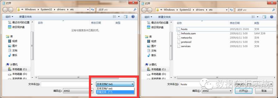 第三步,打开hosts文件,文件,打开,定位到:C:\Windows\System32\drivers\etc 这个路径,然后在文件类型中,选择所有文件 (*.*),就是红色框框那里,没错,然后你就可以看到一堆没有后缀名的文件了。