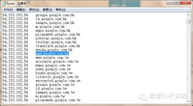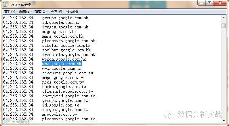 知道怎么修改hosts,那么通过修改hosts去访问Google就轻而易举了,每天都有不少人通过Google访问到我的博客网站的,他们如果是通过Google搜索到我的网页,那么他们访问的时候,http协议的头,referer这个属性,就会是谷歌的域名,所以,我就可以根据这个referer属性,找到它访问的真实的IP地址,也就是Google服务器的IP地址,yes,这样子,我就可以在我本地的hosts加上它,去访问伟大的Google大神了。