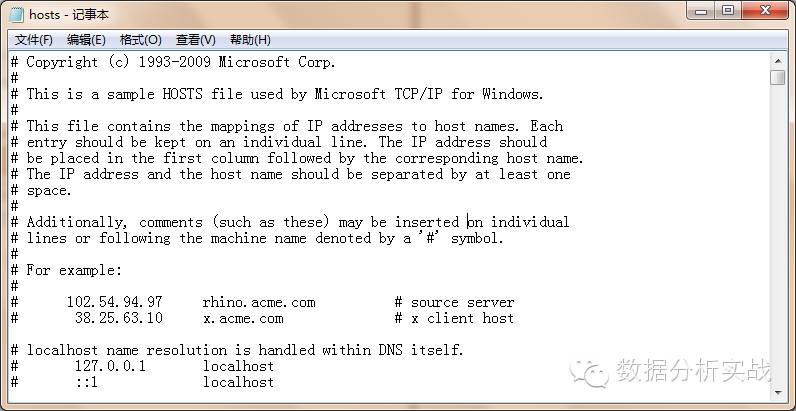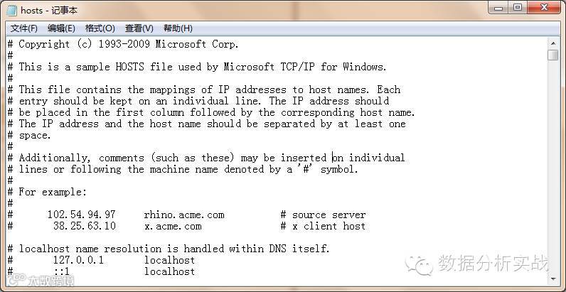 第四步、选择hosts这个文件,打开它,一般来说,它长这个样子的,当然都是英文,因为普通人很少用得到它,所以微软也懒得为你们翻译了;