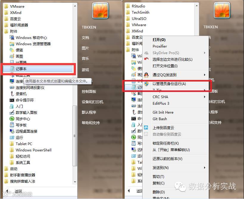 第二步:对着记事本右键,以管理员身份运行,记住一定要以管理员身份运行;