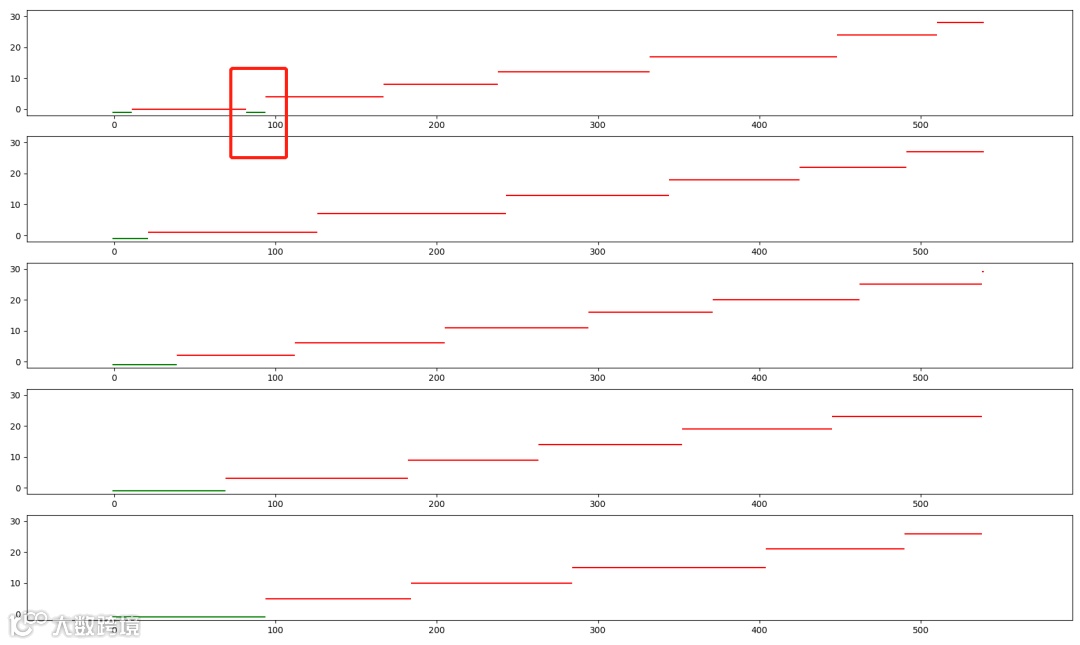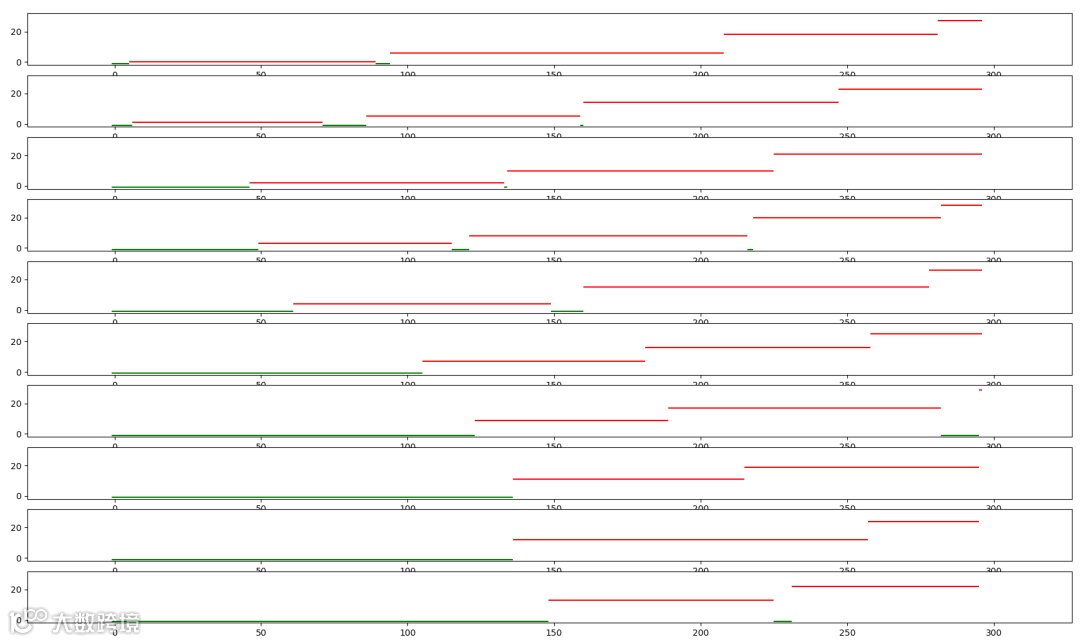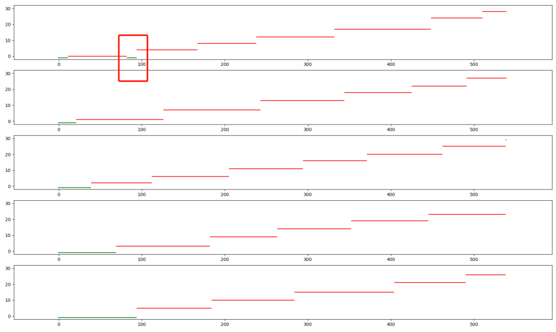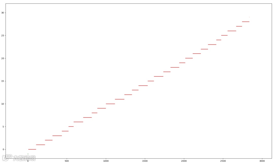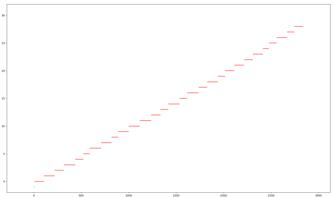 然后是 y 轴,也就是纵轴,是具体某一个人,当厕所空闲的时候,值为 -1,也就是那个绿色的小点,第一个用户从0开始,以此类推,每个红色的直线,就是每个用户使用厕所的时长。