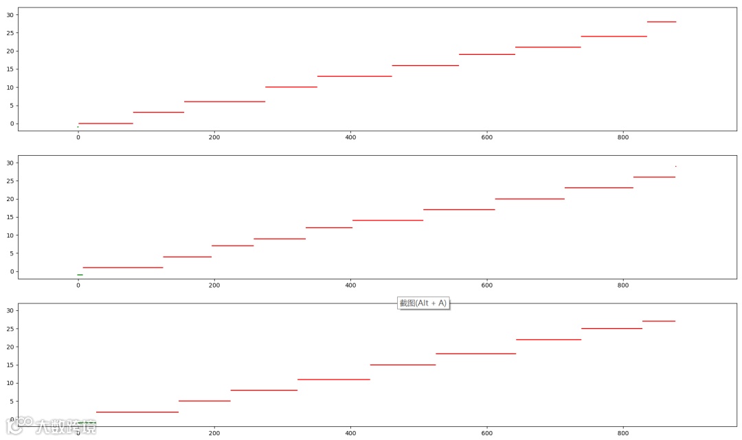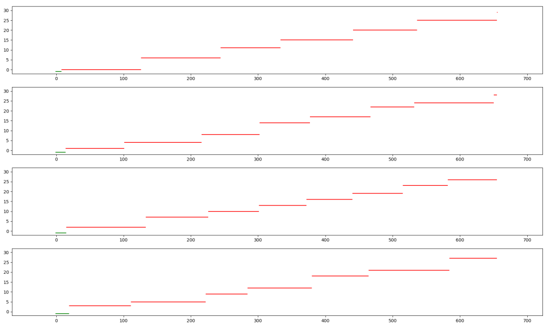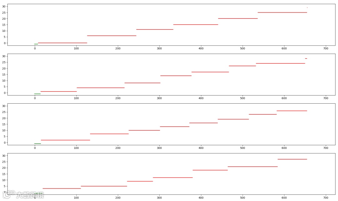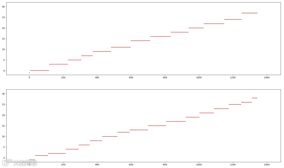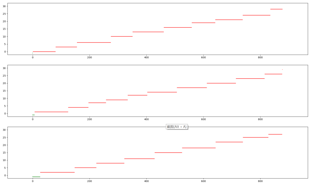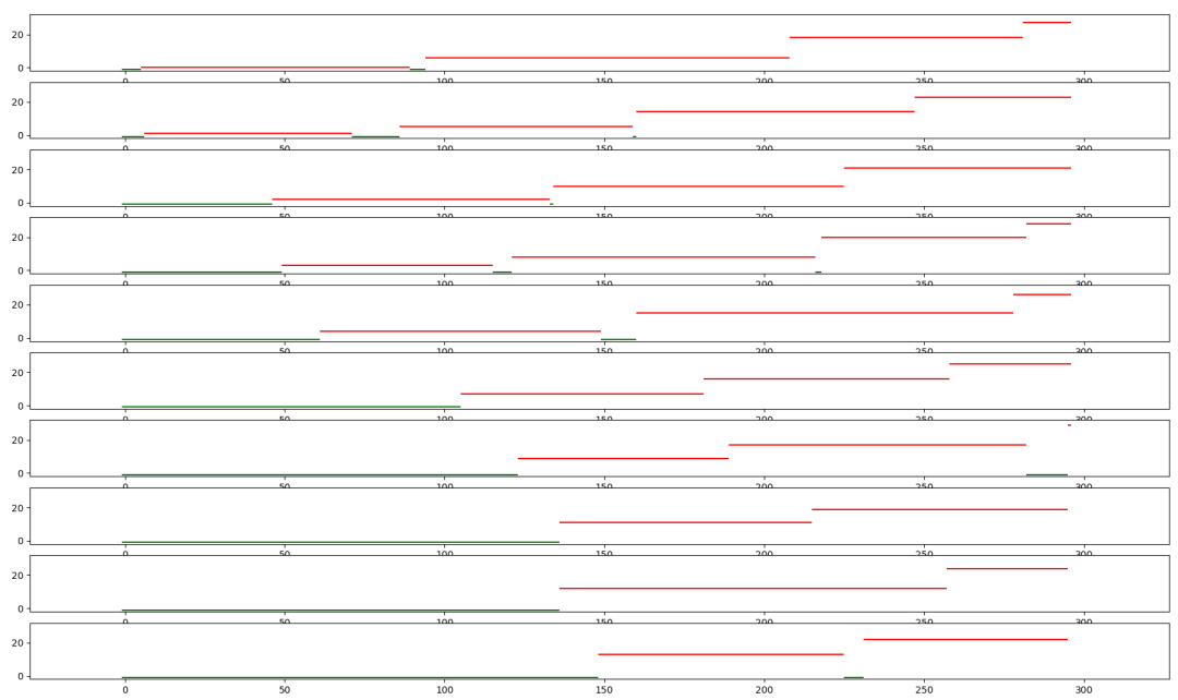 然后是 y 轴,也就是纵轴,是具体某一个人,当厕所空闲的时候,值为 -1,也就是那个绿色的小点,第一个用户从0开始,以此类推,每个红色的直线,就是每个用户使用厕所的时长。