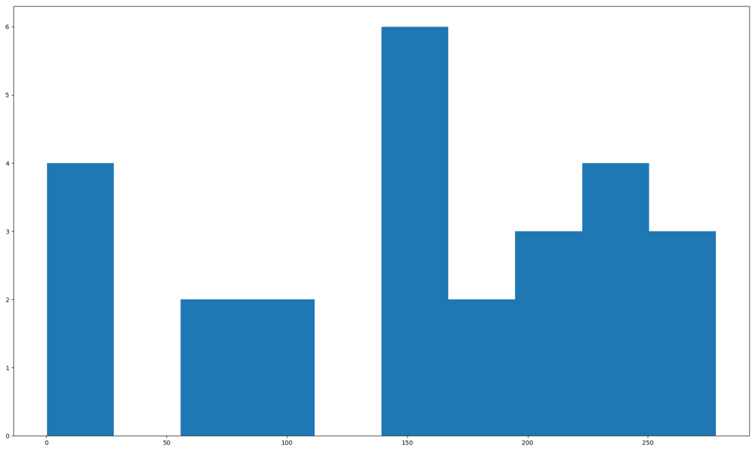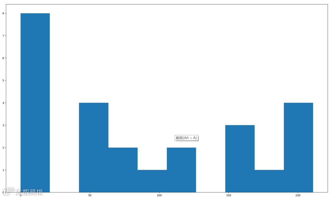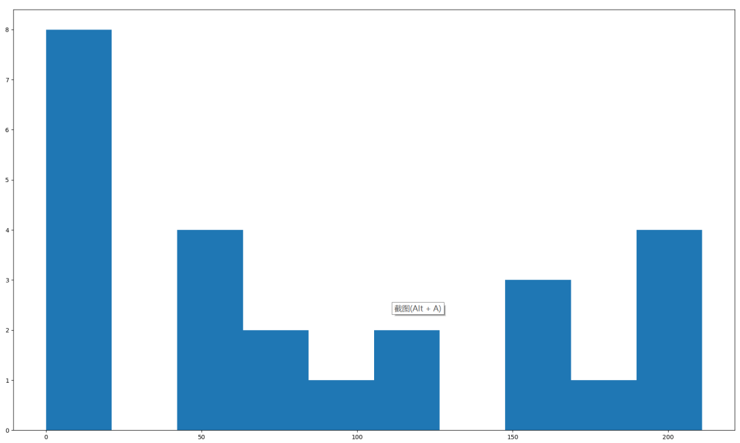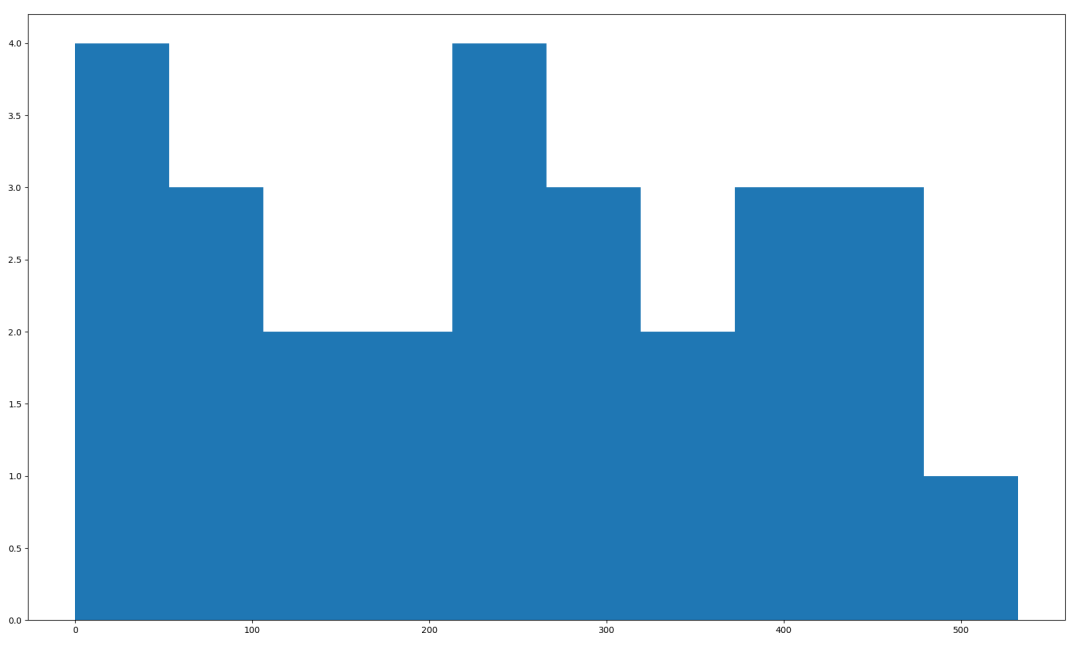 可以看到,整个排队上厕所的时间,一直延续到600以内,也就是10分钟左右,时间上,已经得到非常大的缓解,在第一个厕位100秒左右的时候,还出现了一个没人用的空挡(绿色的横线)。再来看看每个人需要等待的时长分布: