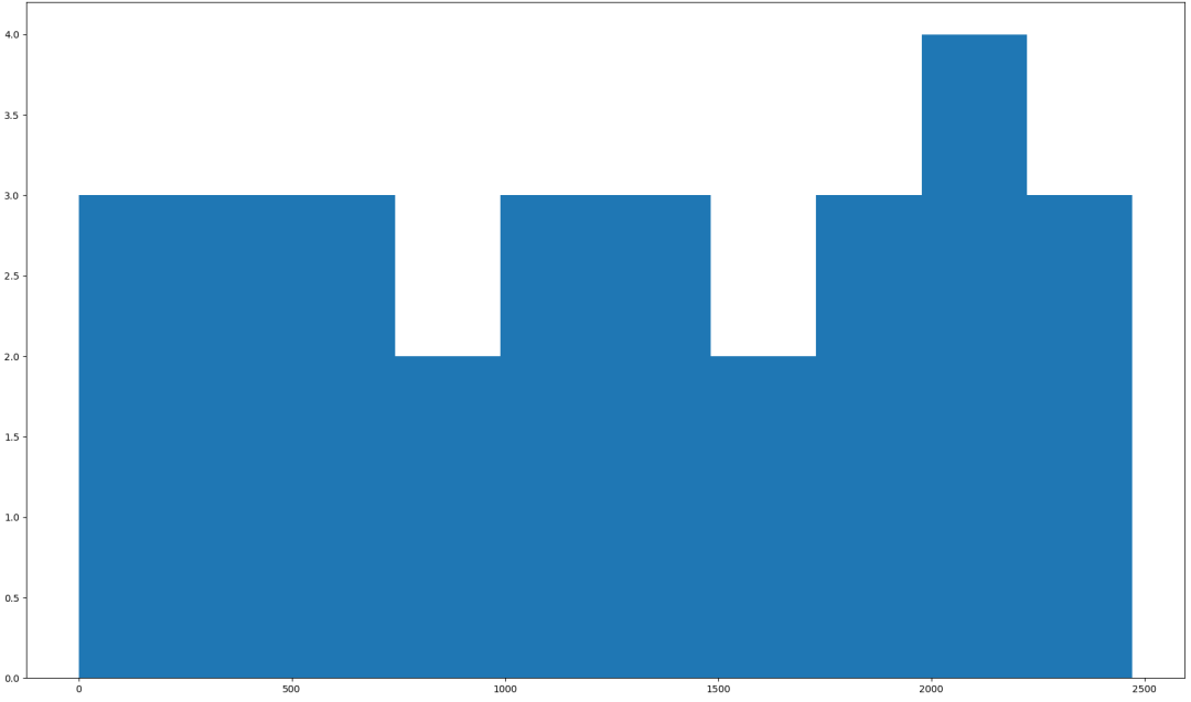 可以看到,整个排队上厕所的时间,一直延续到1400秒,也就是23分钟左右,这个时间也是非常可怕的,再来看看每个人需要等待的时长分布: