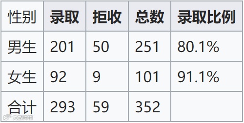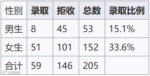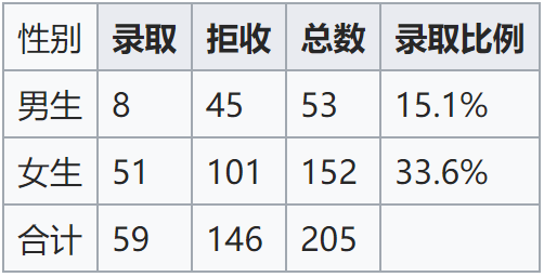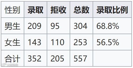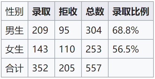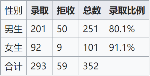 根据上面两个表格来看,女生在两个学院都被优先录取,即女生的录取比率较高。现在将两学院的数据汇总: