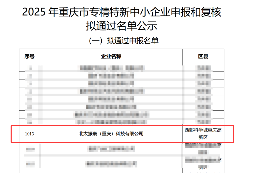 经严格评审及社会公示无异议,由北京大学、北京大学重庆大数据研究院联合孵化的北太振寰(重庆)科技有限公司(以下简称“北太振寰”)成功通过2025年“重庆市专精特新中小企业”复核认定,入选《2025年重庆市专精特新中小企业申报和复核拟通过名单》。