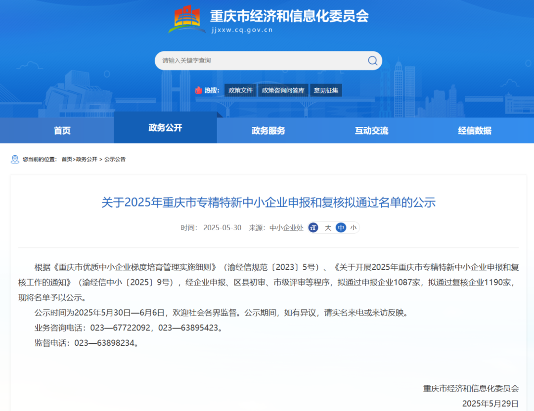 近日,重庆市经济和信息化委员会发布的《关于2025年重庆市专精特新中小企业申报和复核拟通过名单的公示》结束公示期。