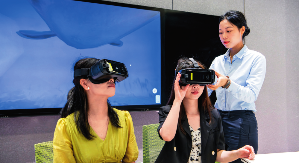 在网龙网络公司的中国福建 VR 体验中心,两名参观者在体验 VR“智慧教室”(2024年7月18日摄)魏培全摄/本刊