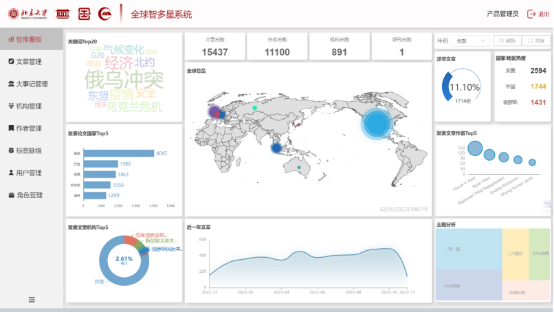 北京大学大数据分析与应用技术国家工程实验室、国际关系学院、区域国别研究院、北京大学长沙计算与数字经济研究院共同开发智多星系统。全球每个国家、地区都有自身独特的运转系统。该项目依托国际政治、国际关系、区域国别学科基础,开展对不同国家、地区的复杂系统研究。通过跟踪全球主要智库和国际组织的动态,构建动态系统研究中全维度监测区域与国别的方法,将特定国家、区域置于全球动态演进的框架下进行观察和分析,并推动形成相关理论,建立动态监测中国与世界关系的评估框架与指标体系。相关理论成果已在北京大学大数据分析与应用技术国家工程实验室及北京大学长沙计算与数字经济研究院的支持下完成了产品研发及在线部署,在该学科的理论研究和人才培养等方面发挥了较好的促进作用。
