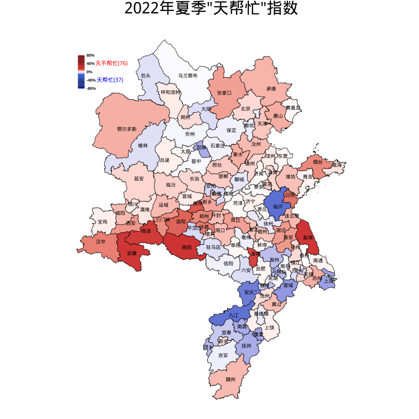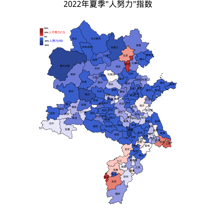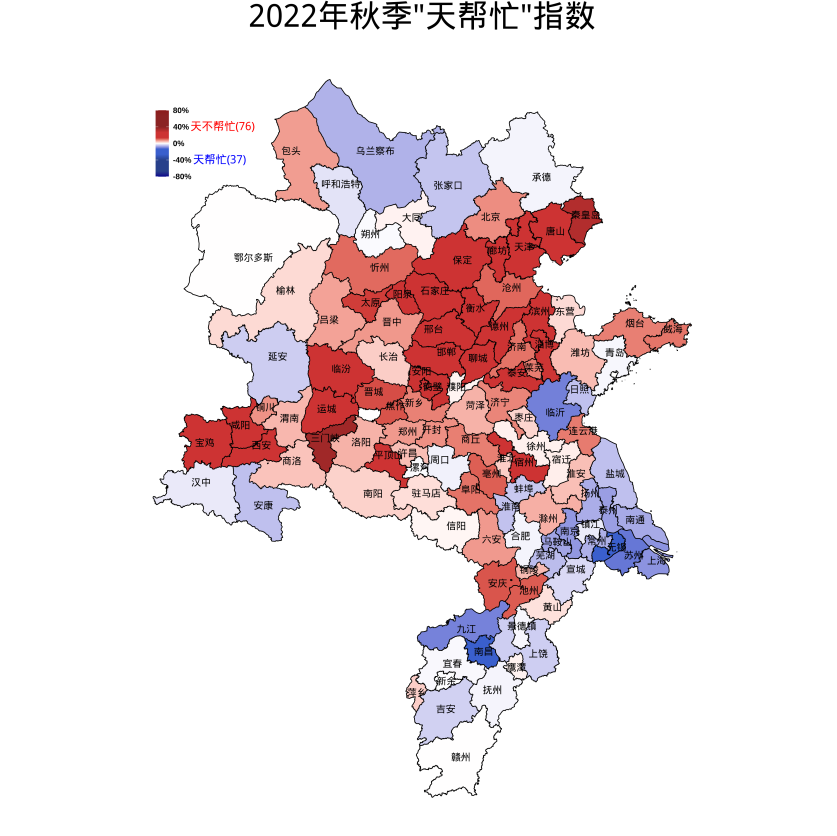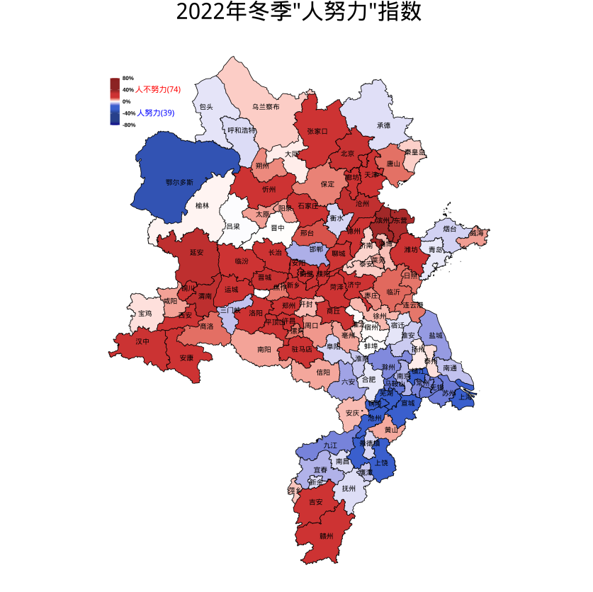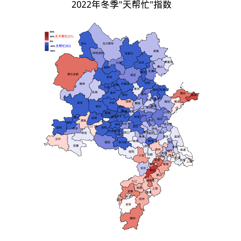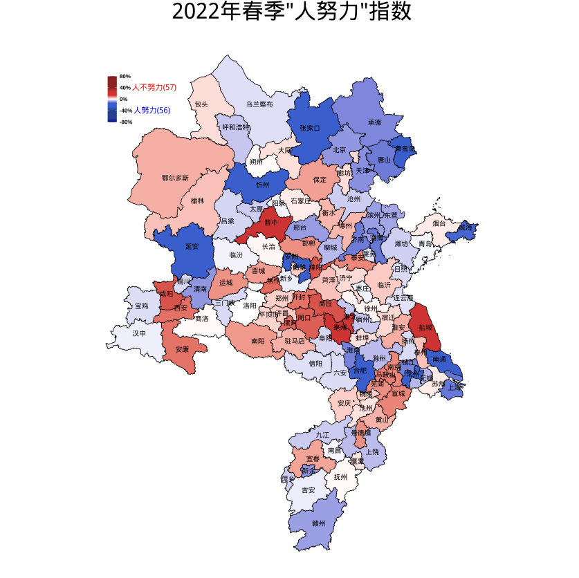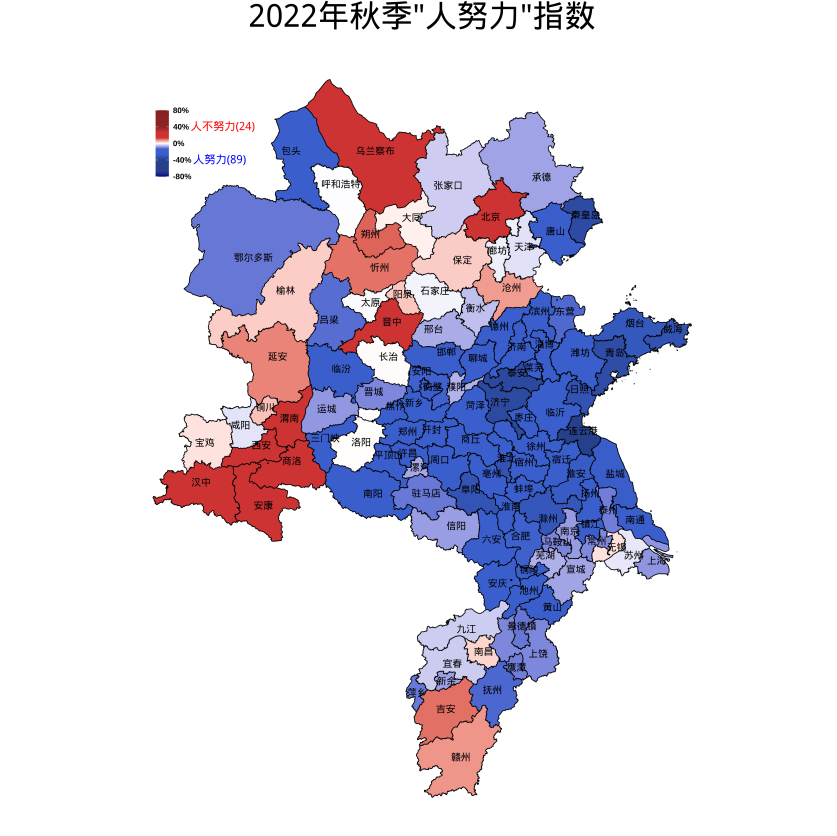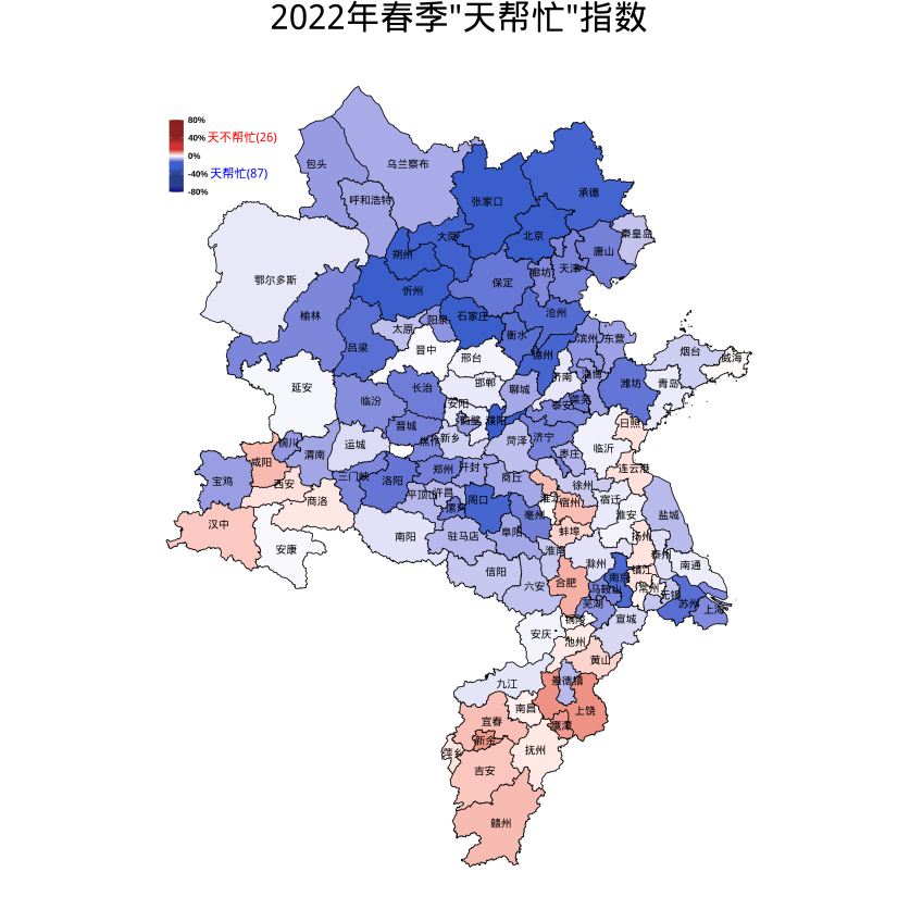 图7:“3+110”城市2021年各季节PM2.5“人努力”和“天帮忙”指数地图