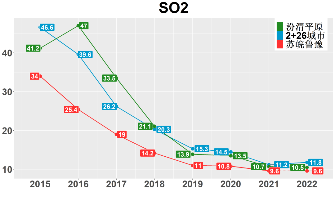 图6:“2+26”城市、汾渭平原和苏皖鲁豫交界地区六种污染物年平均浓度时间序列图