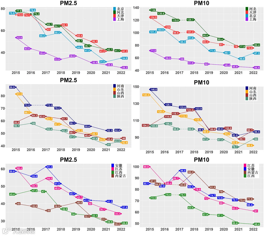 图2:九省三市去除气象因素影响后PM2.5和PM10年平均浓度时间序列(微克/立方米)