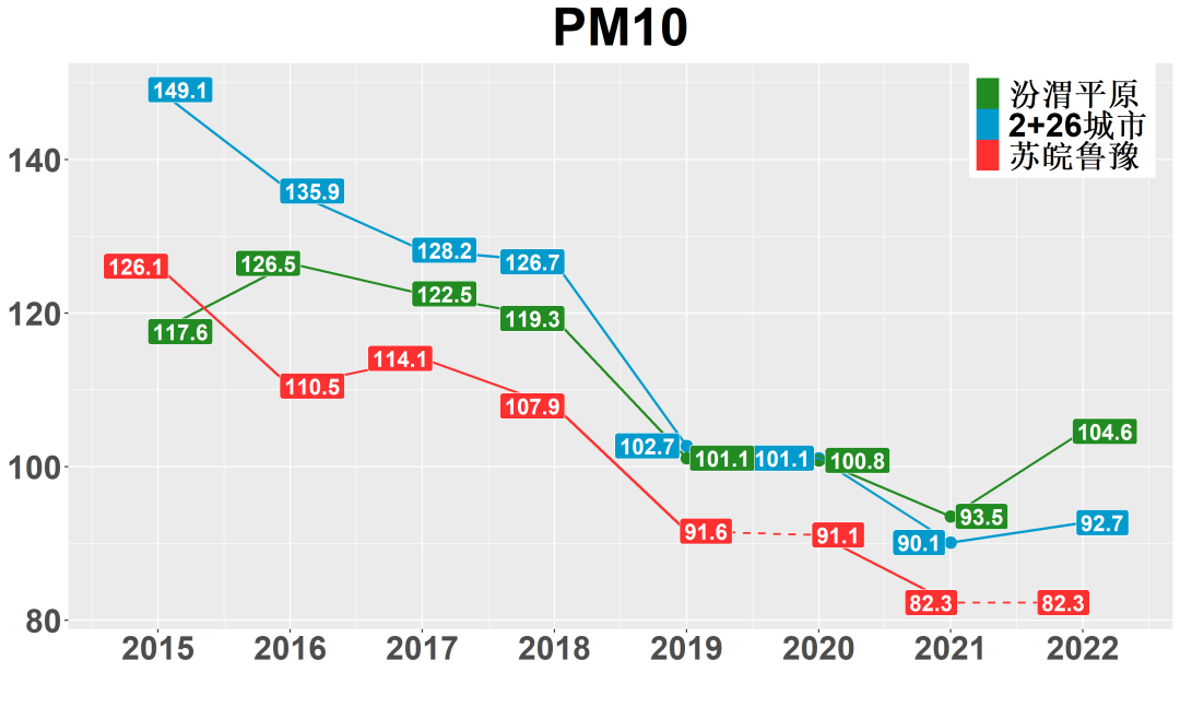 2022年可吸入颗粒物PM10浓度在北京、山西、陕西、河南和河北五省市出现反弹,自2013 年后少有如此规模的上升。整体上,2022年“3+110”城市PM10年均浓度的增幅均值为1.5%。从纵向排名来看,2022年PM10年均浓度排名前三的省市分别是山西、河南和陕西,均不低于88微克/立方米。PM10在这五个省市的反弹原因主要来自于两方面,一是PM2.5的显著上升或下降放缓,二是PM10−2.5(指PM10中空气动力学直径大于2.5微米的颗粒物)的增加,相较于2021年,共有64个城市的PM10−2.5年均浓度上升,这导致“3+110”城市的年均PM10−2.5浓度平均上升2.4(7.6%) 微克/立方米。PM10−2.5与臭氧已成为当前的两个主要污染物。