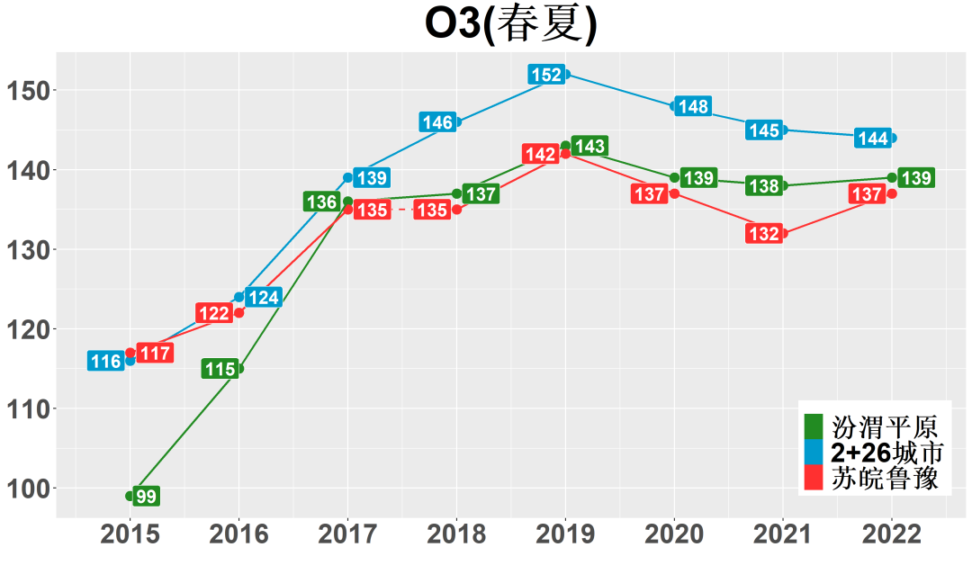 “3+110”城市中有66个城市春夏八小时臭氧90%分位数浓度出现反弹,上海市反弹最大,达24.5(14.5%)微克/立方米;23个城市反弹超过2019年。2022年春夏臭氧的极端污染区域仍集中在京津冀及周边地区,其中天津、北京、山东90%分位数浓度最高,分别为206、201和201微克/立方米。相比2015年,2022年北京、上海和内蒙四市的春夏八小时臭氧90%分位数浓度分别下降了6%、3% 和1.8%,其他八省一市均无明显改善。