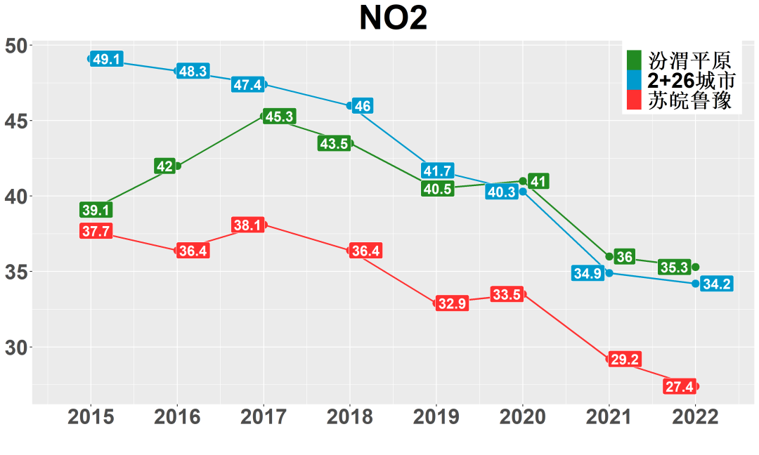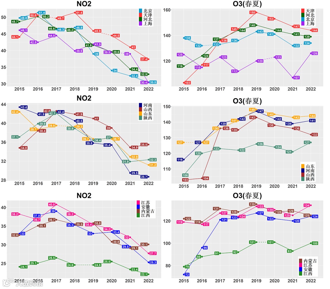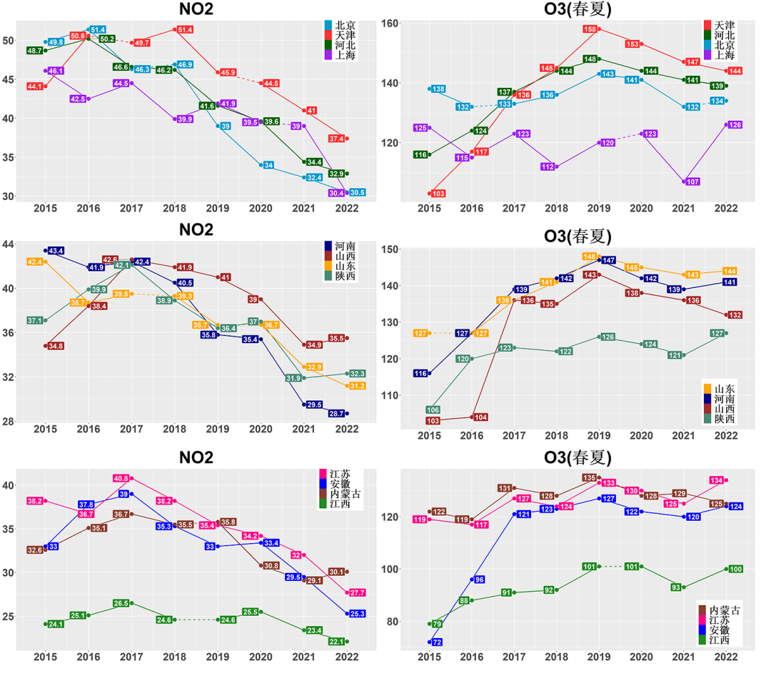 图3:九省三市去除气象因素影响后二氧化氮和八小时臭氧(春夏)年平均浓度时间序列(微克/立方米)