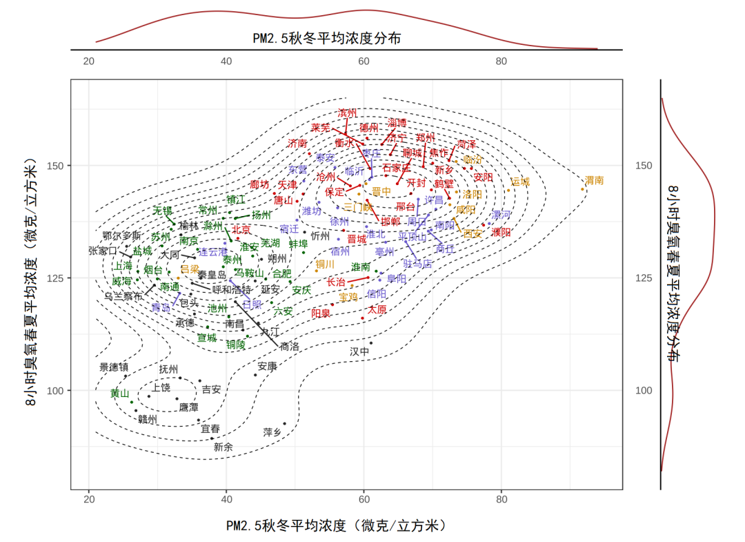 上图是“3+110”城市2022年和2021年PM2.5秋冬和8小时臭氧春夏平均浓度的联合分布。左图的联合分布呈现出三个峰值,将“3+110”城市明显地分成三个群体。一个是主要由“2+26”城市、苏皖鲁豫地区和8个汾渭平原城市组成的高PM2.5和高臭氧群(双高群);一个是主要由长三角和北方六省边缘地区城市构成的相对低PM2.5和低臭氧群(双低群);第三个是主要由江西城市构成的集群,其春夏臭氧平均浓度显著低于前二者。北京虽然属于“2+26”城市,但依然保持在双低群,格外亮眼。