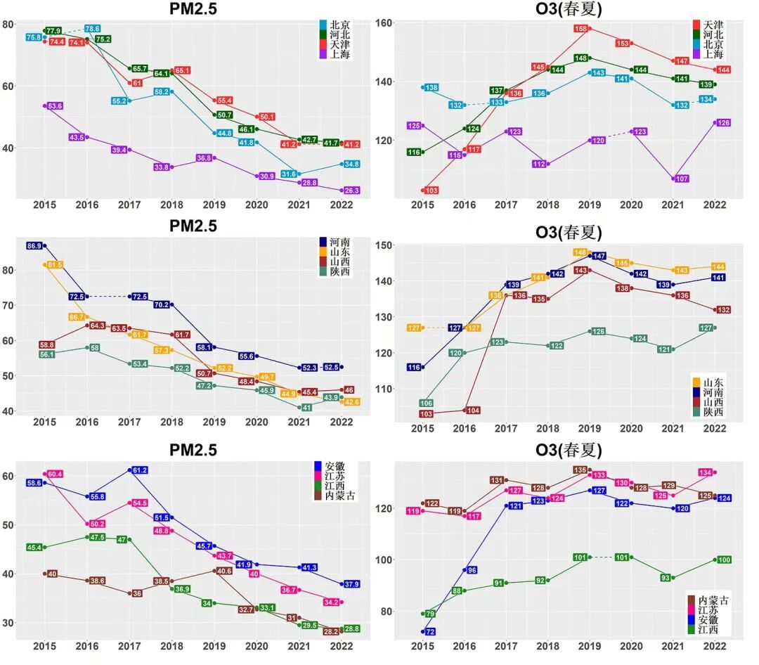 图1:九省三市去除气象因素影响后PM2.5和八小时臭氧(春夏)年平均浓度时间序列(微克/立方米),实线(虚线)代表在5% 统计学显著水平比上年有(无)显著增加或减少