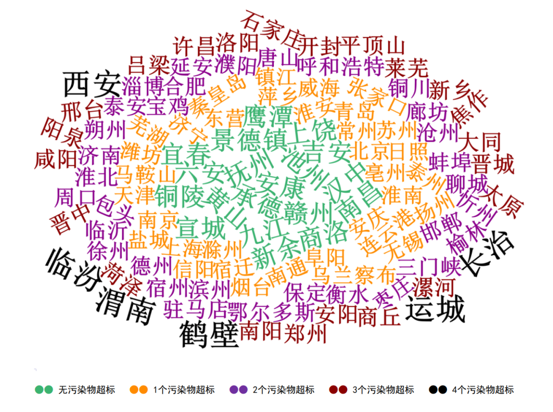 为了方便各级部门了解2022年的六种污染物情况,同时考虑过去六年的浓度变化情况,找到每个城市突出的污染问题,研究团队绘制了六种污染物气象调整后的浓度的监视坐标图和“3+110”城市2021年超标污染物情况的汇总表。报告显示:长治、鹤壁、临汾、渭南、西安和运城6市四种污染物过高;三种污染物超标的有22个城市;两种和一种污染物超标的各有32和34个;安康、承德、池州、抚州、赣州、汉中、黄山、吉安、景德镇、九江、六安、南昌、商洛、上饶、铜陵、新余、宣城、宜春和鹰潭19个城市无超标污染物。超标城市数最多的污染物是8小时臭氧(春夏),有91个城市超标;其次是PM10−2.5(59个)和PM2.5(24个),一氧化碳(7 个)和二氧化氮(5 个);二氧化硫仅有2个城市超标,说明对该污染物的治理效果显著。这也说明“3+110”城市的臭氧污染已经超过PM2.5成为首要大气污染问题。这对各城市在下一步的大气污染治理中选定重点治理方向有所帮助。