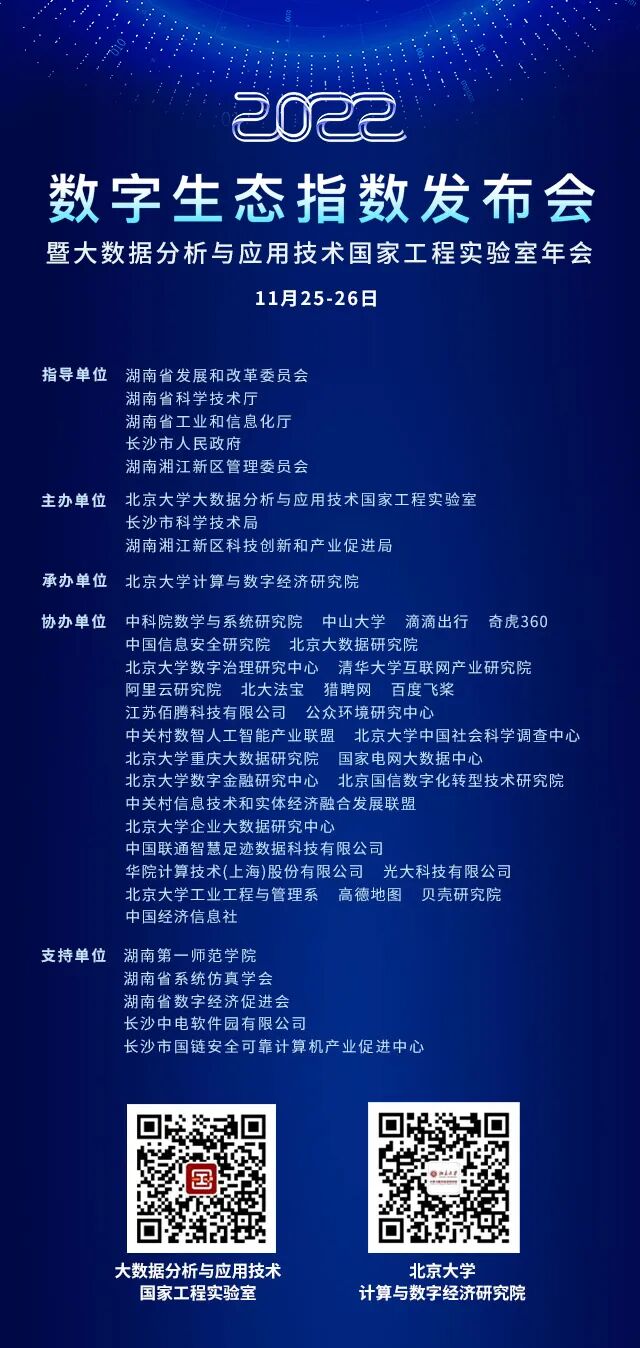 11月26日,院士专家、政府领导、企业机构权威人士将汇聚一堂,对国内外数字经济发展格局、国内城市群数字化态势、湖南以及长沙的数字生态建设工作进行深入研讨,共同为营造健康活跃的数字生态环境建言献策,为数字生态建设、发展数字经济提供坚实的智力支持,共创数字经济发展的美好前景。